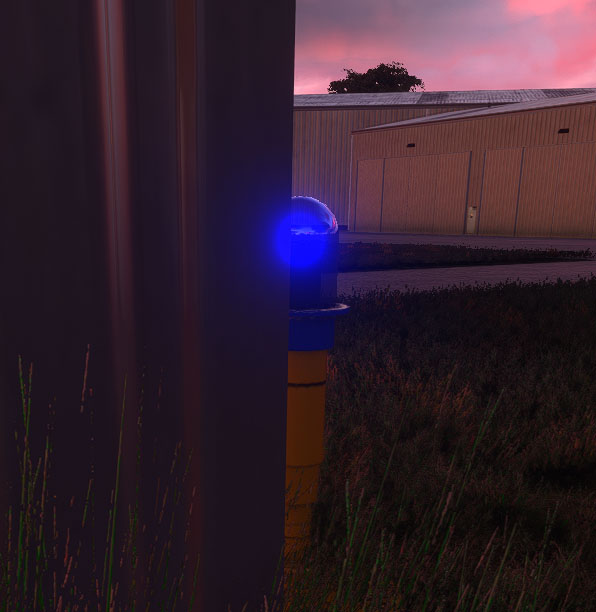 This improves the visibility from a distance somewhat but by far not enough. Those half meter baubles look like mere candles just from the other end of the runway. Something seems to be very different compared to the stock blue taxiway lights and the street lamps far in the background.