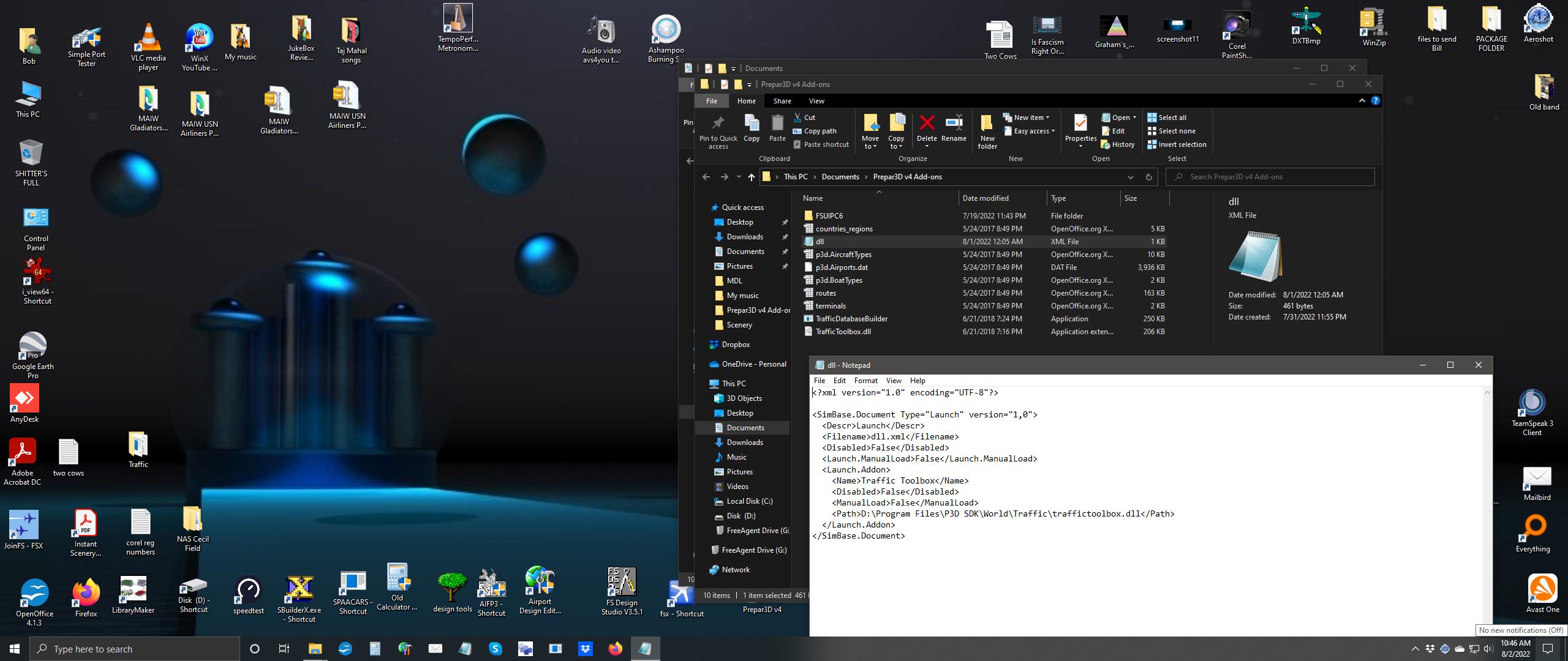 acc to p3d I did download p3d4.5 AND skd 4.5 I just now removed it and downloaded it again. see- screenshot. yes I leave fsuipc alone but the other stuff? is that dll now a dll.xml? how change it back? btw reinstalled sdk 4.5 into same path as before after removing the old one.