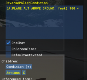 PropertyTriggers used to have a child with the condition of the trigger. This has changed to a ReversePolishCondition in MSFS. Just click on the child condition. You will see the type like LessThan or Equal. If you click on it you will see LHS (left hand side) and RHS (right hand side). Remember the values. In the ReversePolishCondition, first fill in the LHS, then the RHS, and then the type.