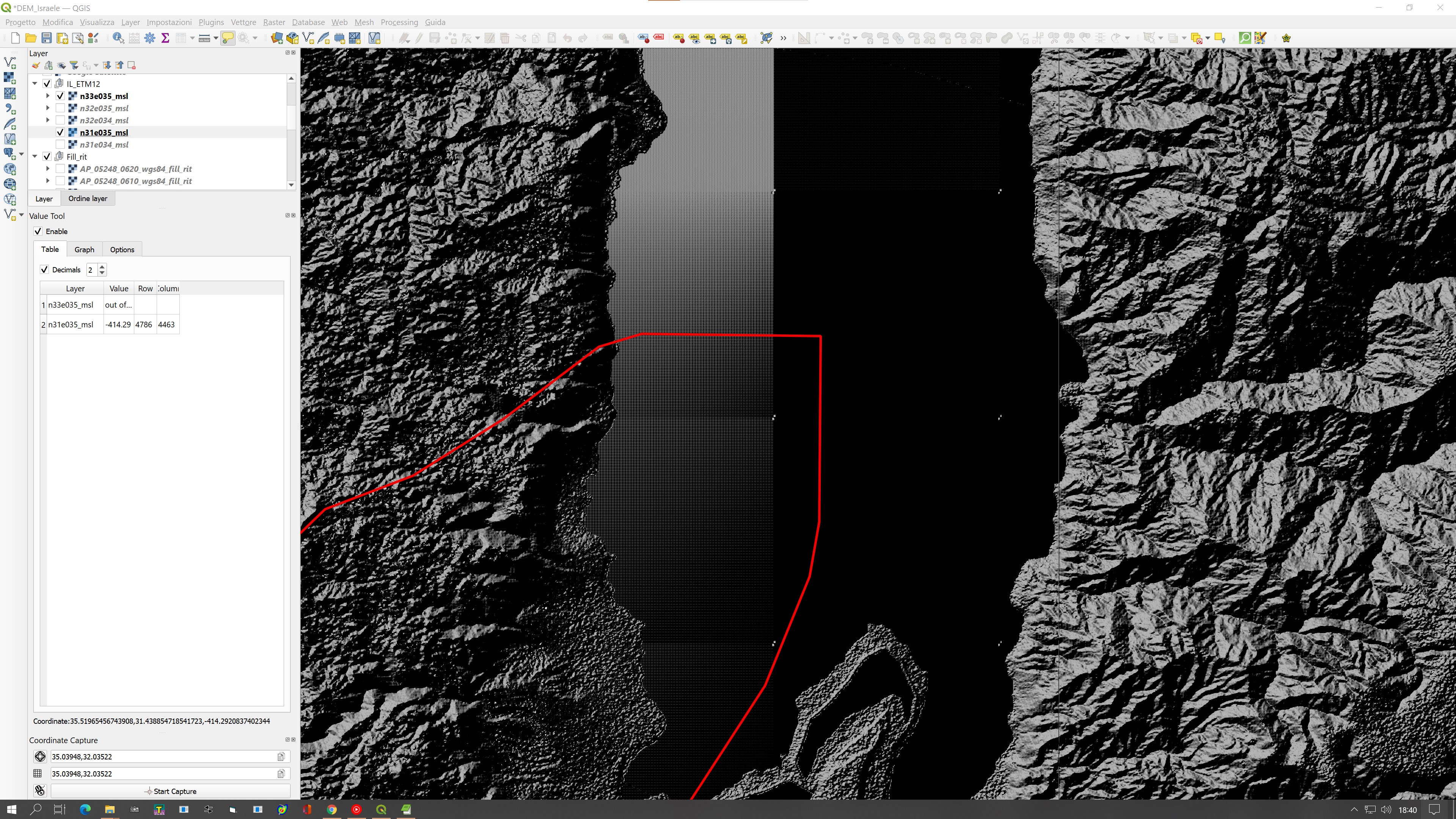 This is the Dead Sea with ALOS PALSAR DEM at -419,25 meters below sea level. Pixel spacing Dimensione Pixel 0.0001231328205903992057,-0.0001231383066624403