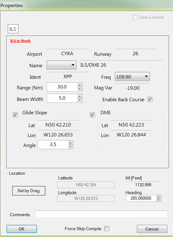 Flying into YKA from the east is flying down a tight valley. The ILS now is at a stock heading set at 285.0000 and suggests a variation of -19.00 which I believe is currently -16.00 but I'm not betting on that.