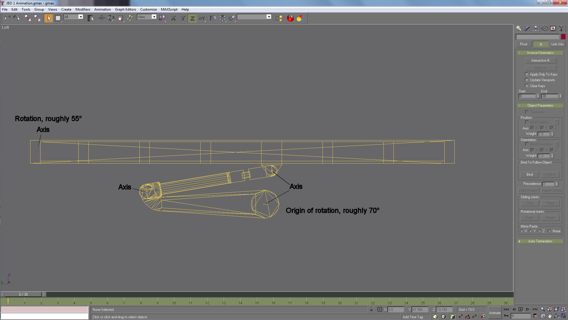 I've animated the top platform and Limb Solver (IK Chain01) from 0 to 100 in this example, there are keyframes at 0, 10, 20, 80, 90 and 100. Now the swivel arms need keyframes:–