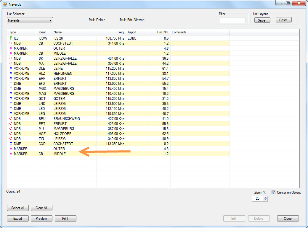 But I found two additional MARKERs in the list under 'Lists' > 'Navaids' in 'Airport Mode'.