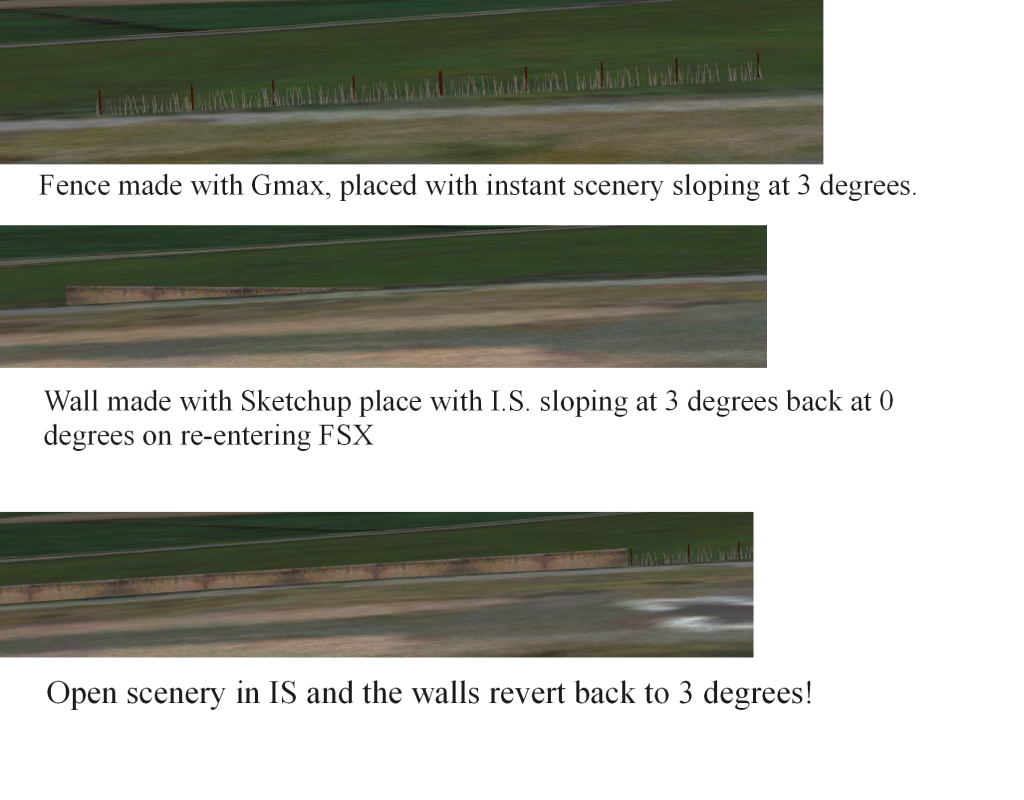 I design scenery for farm strips (www.northern-microlights-fsx.co.uk) and as the terrain is anything but flat I have to slope the walls and fences. To do this I use Instant Scenery. Now this is where the funny things happen. If I design an object say a wall or a fence in Gmax then when positioning I use a 3degree slope, when I exit FSX and return the object is still sloping. However if I design the object in Sketchup and apply the same slope it looks great while I am in FSX but after exiting and returning the slope has reverted back to 0! When I open the scenery again in IS it has reverted back to 3 degrees!Does anyone have any idea why it should do this.