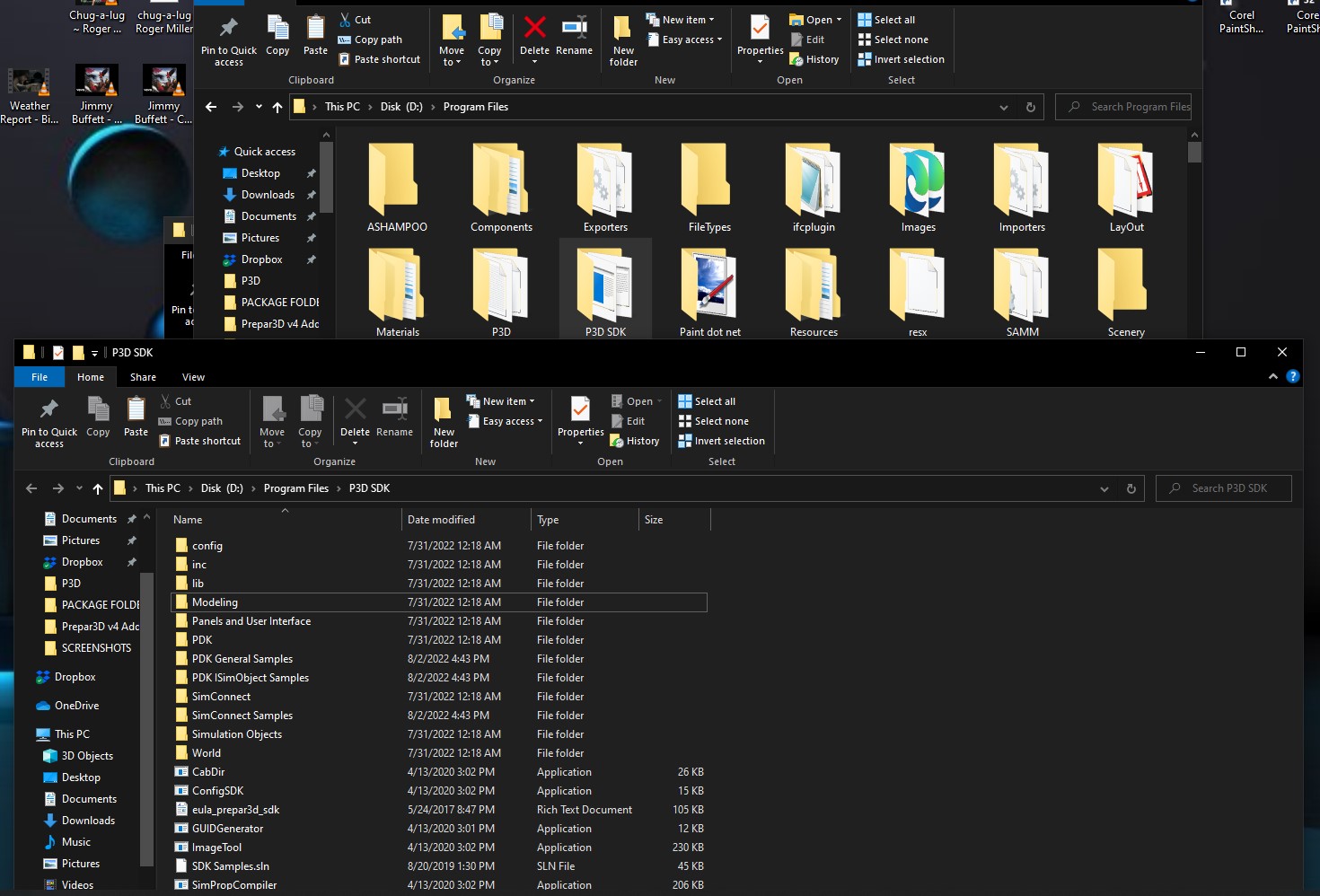 doug- my win10 failed. just now geting things back. I have attached a fjg to show my p3d sdk In the jpg just above is shown that I have p3d4 and the sdk in program files (not program files x86 !!) My sdk does not seem to look like yours. ??? It had stuff like 3dsmax which has the environ, mopdeling, etc in it. Bob