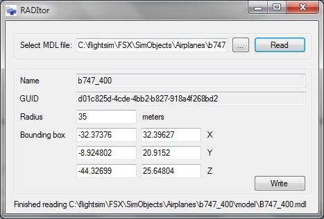 Aircraft designers sometimes face the problem that their aircraft shows too small (or too big) in the rotating preview within FS. This size is controlled by the radius set within the MDL file, but there is no way to directly set it when modelling. The compiler calculates it for you, but unfortunately is sometimes wrong. The Radius Editor (or RADItor for short) is a small tool to help you correct such trouble.