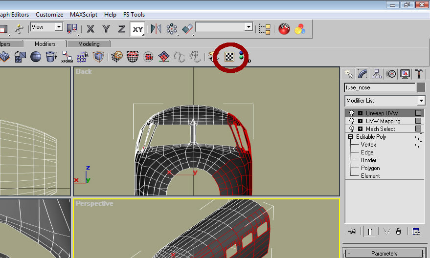 Select "Polygon" and make sure that the option "Ignore Backfaces" is checked - that makes the selection easier. Select the parts of the aircraft you want to texture first. I started by selecting the whole left side and then removing the polygones facing to the top and bottom.