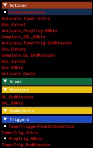 Next, you need to choose the elements you will use to turn your mission map into code. The main elements of a mission are [[MSFS_Mission_Script_-_Actions|Actions]] and [[MSFS_Mission_Script_-_Triggers|Triggers]]. These elements let you check things and do things in your mission. For example, you can check if the player is flying high or low, or if they are in a certain area. You can also do things like play speech, activate or deactivate objects, or change the difficulty. | |||